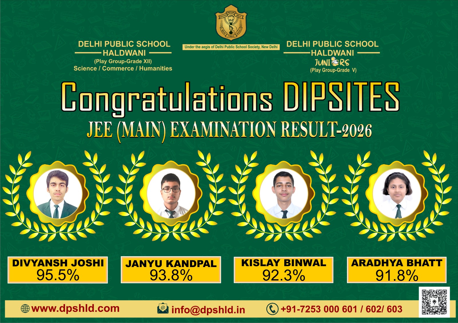 हल्द्वानी – दिल्ली पब्लिक स्कूल (डीपीएस) हल्द्वानी के विद्यार्थियों ने जेईई (मेन) 2026 में शानदार प्रदर्शन करते हुए विद्यालय और पूरे क्षेत्र का नाम रोशन किया है। चार विद्यार्थियों ने 90 प्रतिशत से अधिक अंक प्राप्त कर अपनी प्रतिभा और मेहनत का लोहा मनवाया। विद्यालय के छात्र दिव्यांश जोशी ने 95.5 प्रतिशत अंक हासिल कर सर्वोच्च स्थान प्राप्त किया। वहीं जन्यु कांडपाल ने 93.8 प्रतिशत, किसलय बिनवाल ने 92.3 प्रतिशत तथा आराध्या भट्ट ने 91.8 प्रतिशत अंक प्राप्त कर उल्लेखनीय सफलता दर्ज की। इस उपलब्धि पर विद्यालय प्रबंधन, प्रधानाचार्या और शिक्षकों ने विद्यार्थियों को बधाई देते हुए उनके उज्ज्वल भविष्य की कामना की। विद्यालय प्रशासन ने सफलता का श्रेय विद्यार्थियों की निरंतर मेहनत, अभिभावकों के सहयोग और शिक्षकों के मार्गदर्शन को दिया। डीपीएस हल्द्वानी ने एक बार फिर साबित किया है कि गुणवत्तापूर्ण